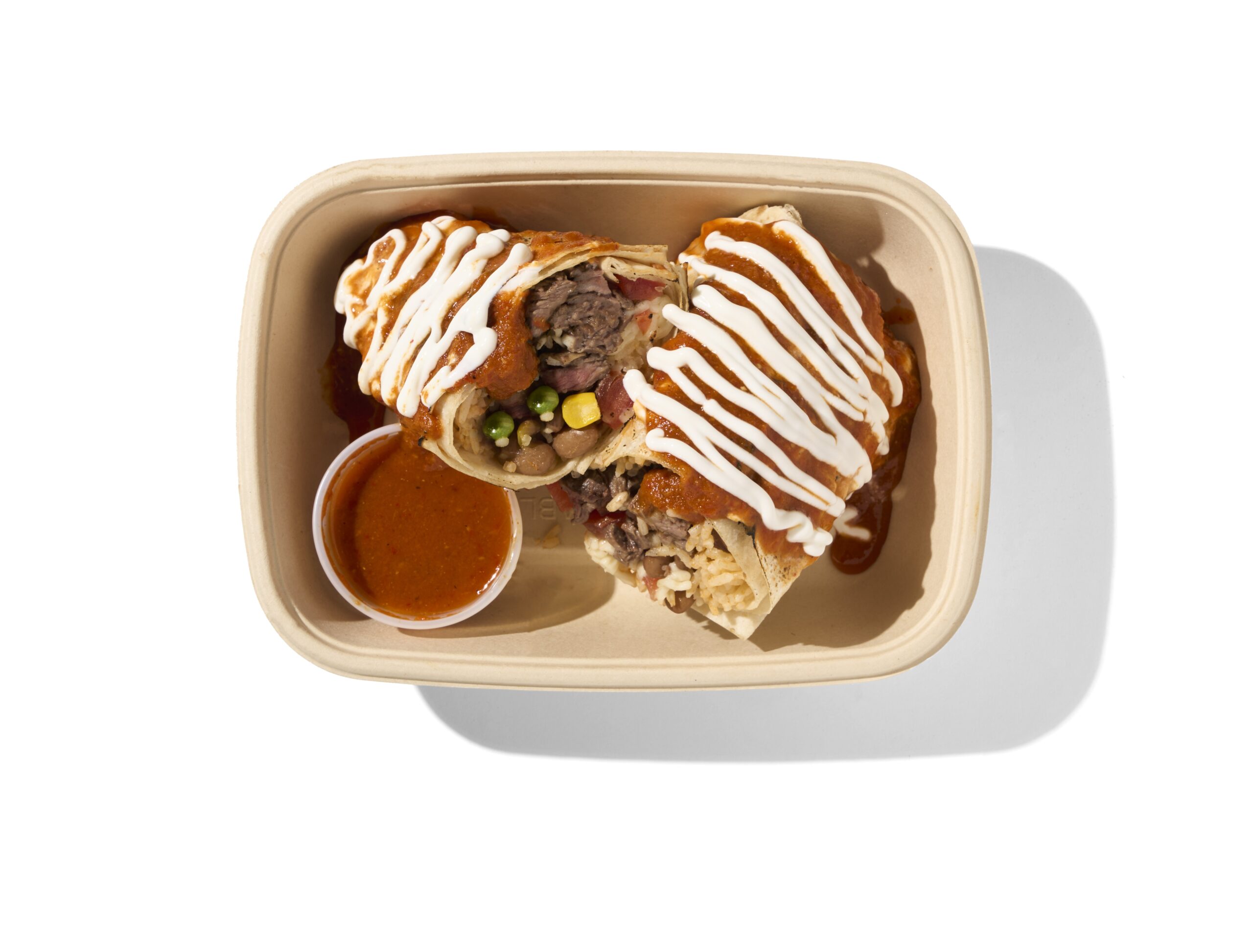 Grilled skirt steak and pinto beans with Mexican rice, smothered in tomatillo, tomatoes, chile guajillo & chihuahua cheese.