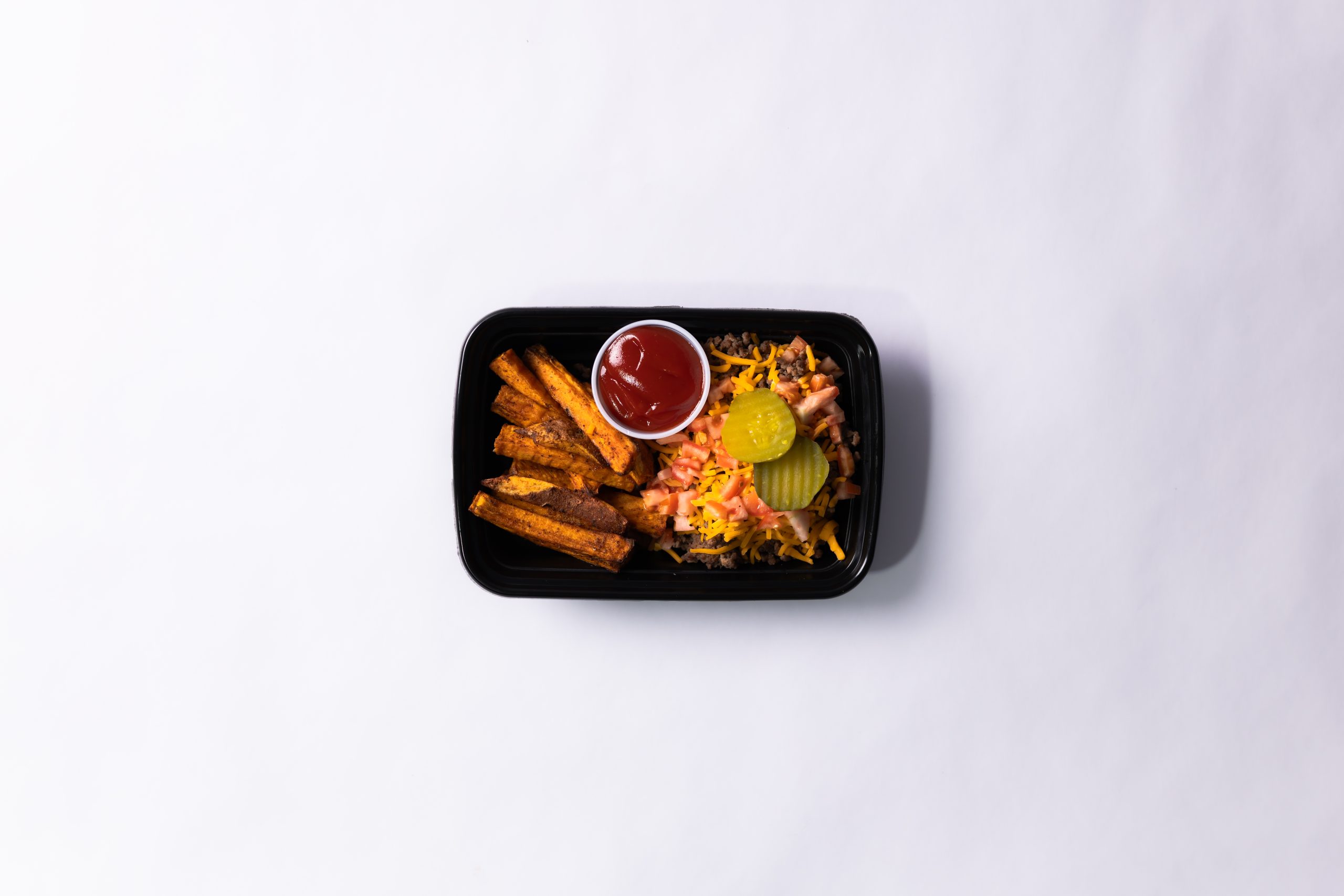ground beef, cheddar cheese, diced tomato, pickles, sweet potato, ketchup, salt, pepper, garlic powder, onion powder, olive oil.